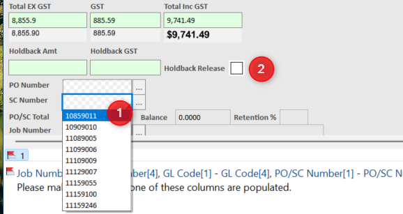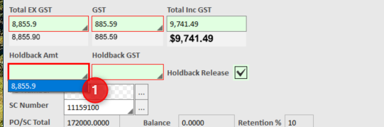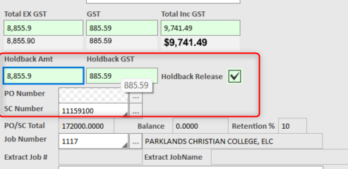 4. Set the Holdback Amount accordingly as per what is on the SubTotal (see below), and the GST will be calculated based on the SubContract Tax Setting.
