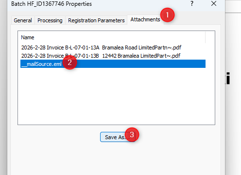 2) Under the Batch Properties, go to the tab "Attachments" and select the attachment or original email (i.e. _mailSource.eml) and click "Save As" to save it on your computer.