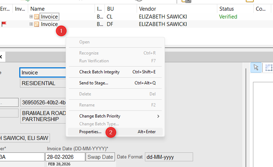 1) Open up the invoice screen, and right click on the white space between the Invoice and the grey line. Select Properties to bring up the Batch Properties.